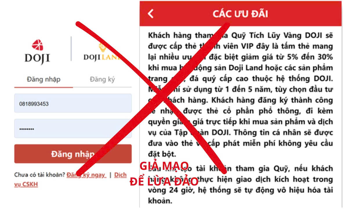 Theo thông tin Tập đoàn DOJI nhận được, các đối tượng lừa đảo sử dụng phương thức gọi điện chăm sóc khách hàng để kêu gọi người dân đăng nhập website có tên miền: https://dojiland.dojib.com/login. Tại đây, đối tượng lừa đảo sử dụng trái phép hình ảnh sản phẩm, logo của Tập đoàn Vàng bạc Đá quý DOJI và Công ty thành viên DOJILAND để dẫn dụ người dân tham gia các gói đầu tư tài chính, quỹ tích lũy vàng hay quỹ tri ân khách hàng với hứa hẹn lợi nhuận cao, được nhận nhiều quyền lợi hấp dẫn khi mua bất động sản hoặc thẻ ưu đãi đặc biệt khi mua sắm sản phẩm của DOJI.