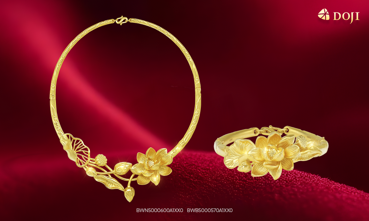 Họa tiết hoa sen được thể hiện trên nền vàng 24K theo ngôn ngữ thiết kế hiện đại, tạo nên sự giao thoa hài hòa giữa truyền thống và đương đại. Khi kết hợp cùng áo dài cưới hoặc váy cưới mang phom dáng cổ điển, những thiết kế này giúp cô dâu trở thành tâm điểm của lễ đường – rạng rỡ, quyền quý và đầy khí chất.