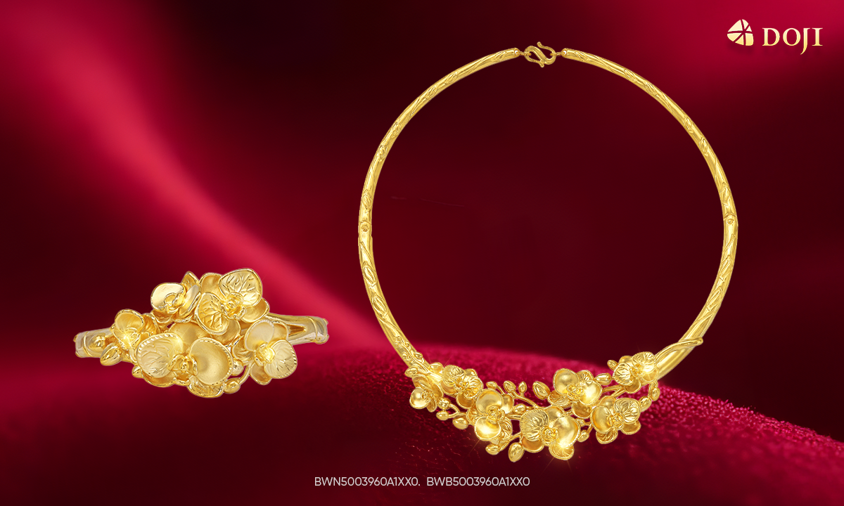 Với cô dâu yêu vẻ đẹp tinh tế và tối giản, các thiết kế trang sức vàng 24K mang họa tiết hoa chùm như tú cầu, đường nét mềm mại là lựa chọn lý tưởng. Hoa cẩm tú cầu là biểu tượng của khởi đầu hạnh phúc và nét nữ tính. Khi được thể hiện vừa đủ sẽ tạo điểm nhấn nhẹ nhàng, giúp tổng thể trở nên thanh thoát mà không làm lu mờ váy cưới. Bông tai hoa thanh mảnh, dây chuyền mảnh với mặt hoa cách điệu hay vòng tay trơn điểm xuyết chi tiết nhỏ mang đến vẻ đẹp tinh khôi, sang trọng theo cách rất riêng.