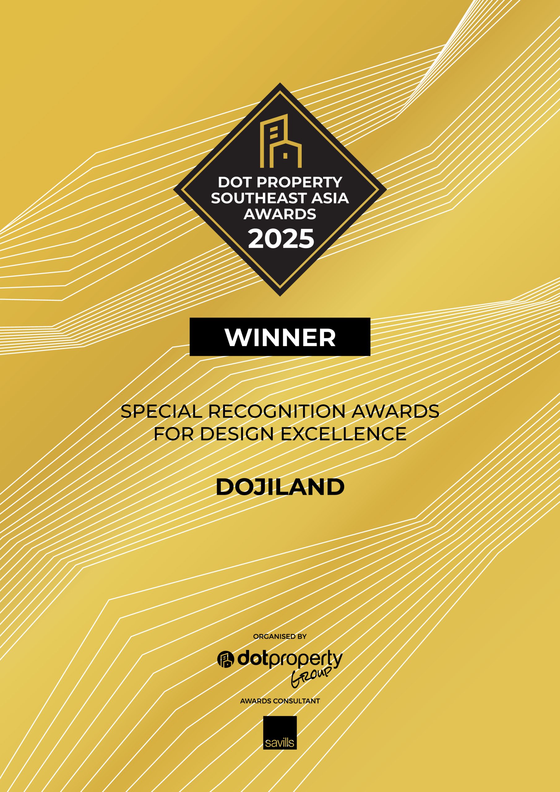 Không chỉ tiên phong kiến tạo chuẩn mực sống sang, DOJILAND còn giành chiến thắc thuyết phục tại hạng mục Special Recognition Awards for Design Excellence Southeast Asia 2025 – Giải thưởng công nhận đặc biệt dành cho doanh nghiệp BĐS thiết kế xuất sắc tại Đông Nam Á 2025.
