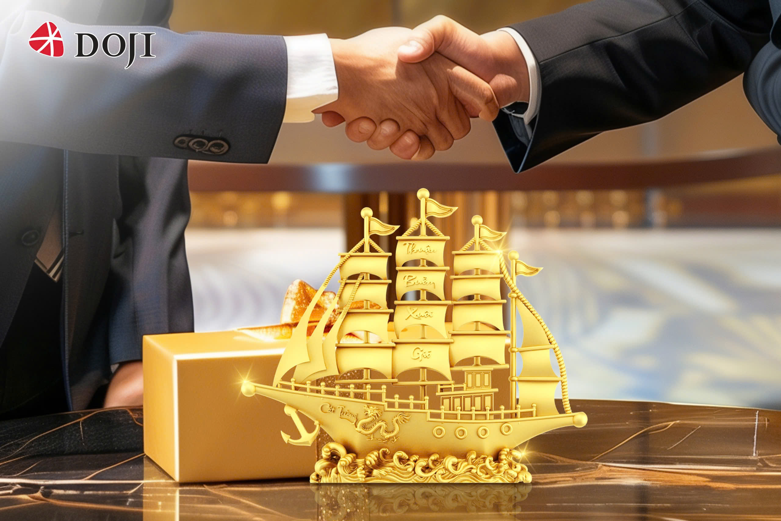 Lựa chọn quà tặng vàng mừng ngày Doanh nhân vừa thay lời chúc về thịnh vượng, may mắn đồng thời thể hiện sự trân quý, tri ân tới đối tác, khách hàng. Bạn có thể lựa chọn những sản phẩm mang biểu tượng phong thủy Á Đông có ý nghĩa về thành công, đại phát và tài lộc tăng tiến như: Thuyền Buồm Cát Tường; Thuận Buồm Xuôi Gió; Kim Ngân Tụ Tài; Tượng Phúc – Lộc – Thọ…